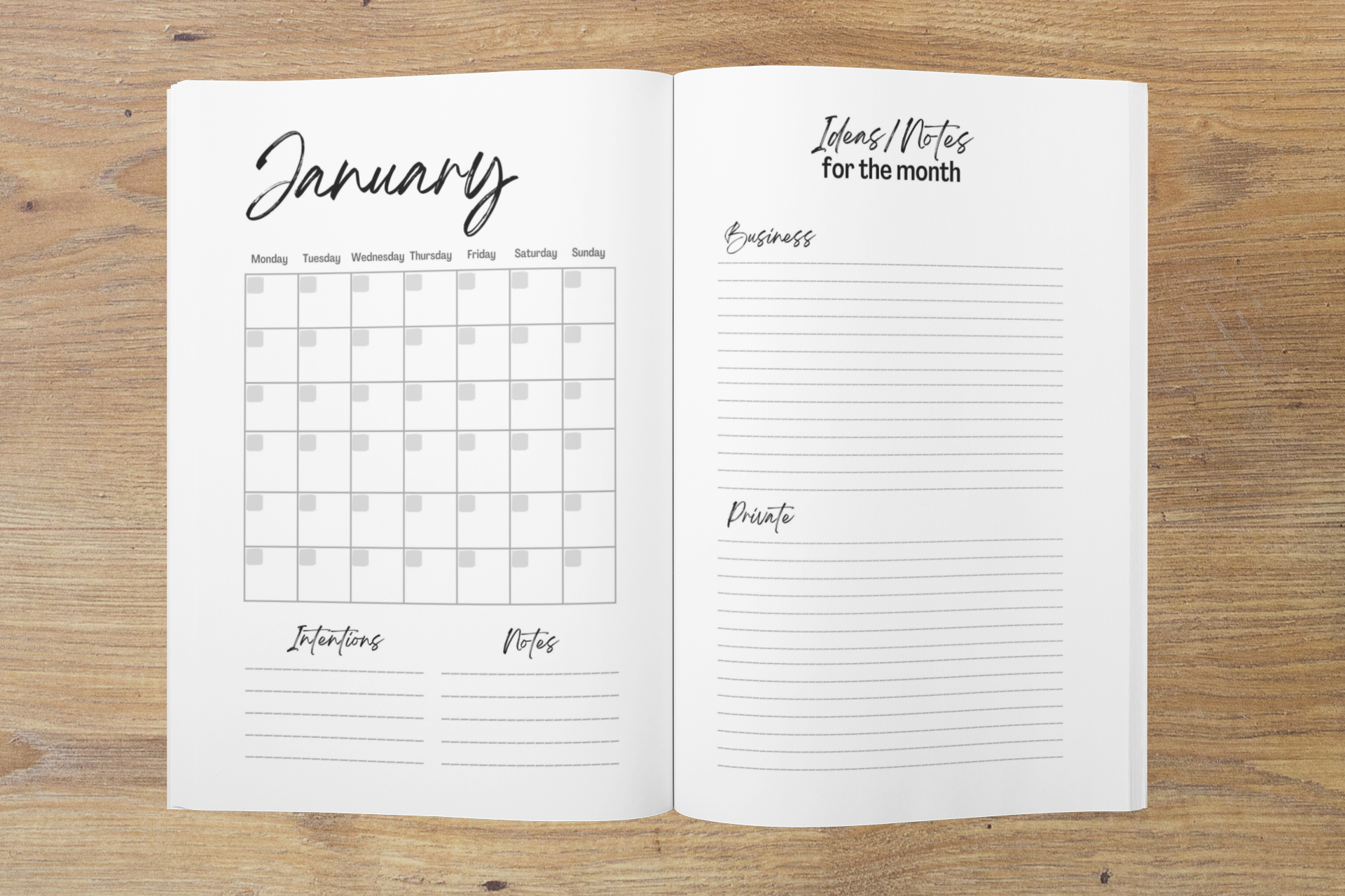 Everything at a glance: Each month has a monthly overview (2 pages) and goal plan (2 pages), 5 weekly overviews each, for enough space whenever the month is starting (shared overview for your personal and your business planning to have everything at one sight - left Business: priorities, due dates, right side Personal: shopping list, to do), 2 shared pages for appointments, as well as a financial tracker and space for reflections (2 page overview for your Business, 2 page overview Personal).