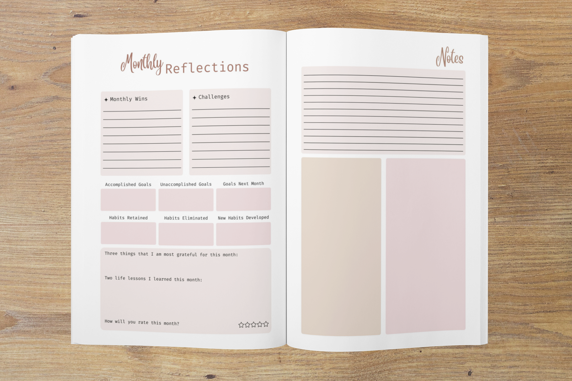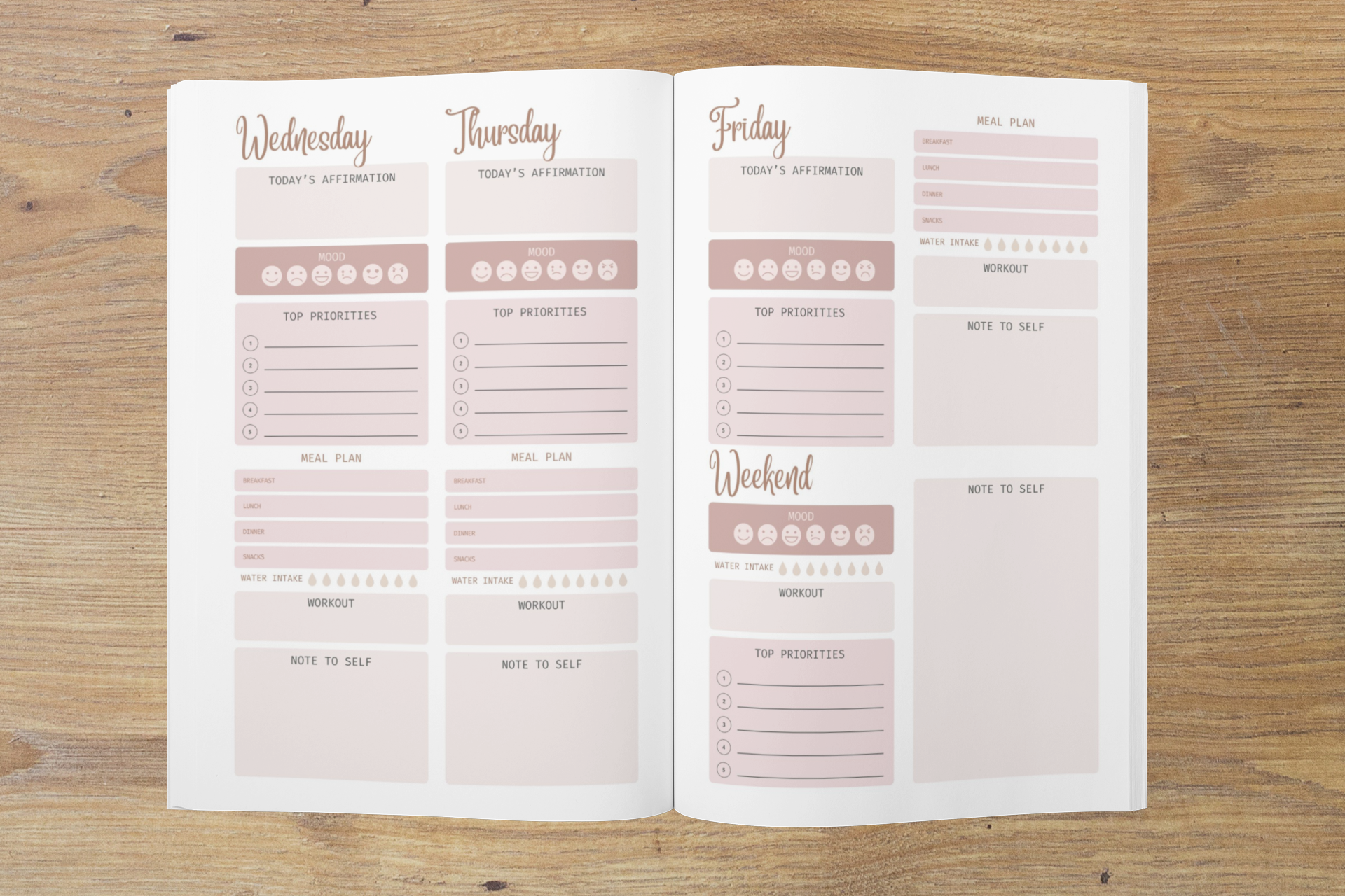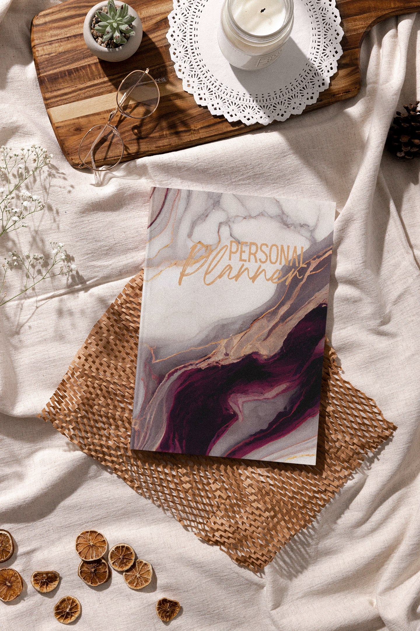 Personal Planner 6x9in / 15,2 x 22,9cm 1 year - 4 page week Cover colour: whiteblackredmarvel Interior colour: colour (brown, beige, rose) Personal Planner - Your Companion for Productivity and Self-care Stay organized, motivated, and on track to crush your goals with our comprehensive personal planner. With carefully curated features designed to enhance your productivity and well-being, this planner is your key to unlocking success in every aspect of your life. Content: 12 months (unnamed): Monthly calendar overview Monthly expense tracker Goal planning Habit tracker Monthly reflections 5 weeks per month to guaranty enough space whenever the month starts: Weekly priority and to do overview Day to day planning with Self-care tracking Additional helpful overall sections at the end: Period tracker Self-Care Challenge 30-day Challenge/Habit tracker Dream Journal Book Tracker Contact details Password tracker Note section